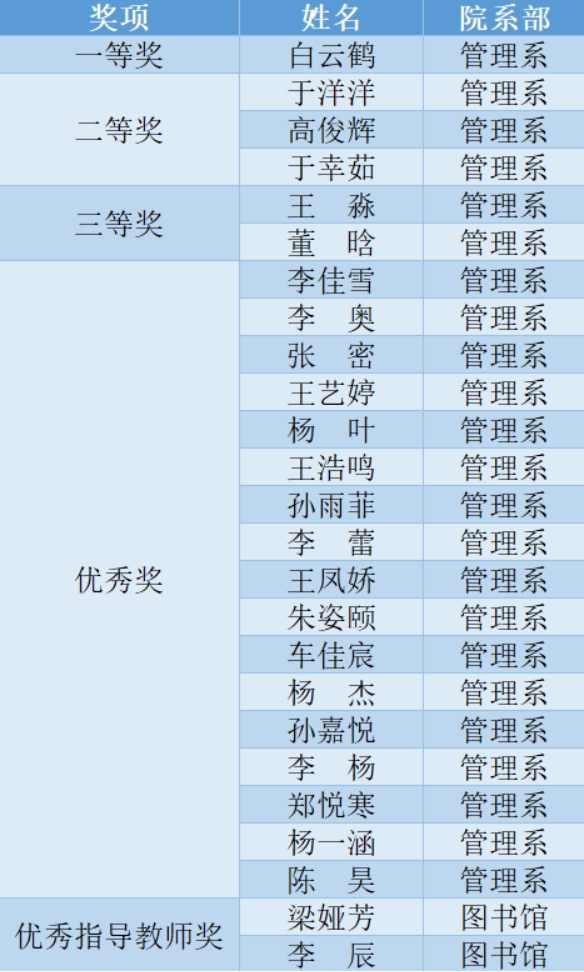 近日,首届“搜知杯”辽宁省普通高校大学生信息素养大赛获奖名单已揭晓,beat365共有23名管理系学生在比赛中获奖,其中一等奖1名,二等奖3名,三等奖2名,优秀奖17名;2名图书馆教师荣获优秀指导教师奖。具体获奖名单如下:
