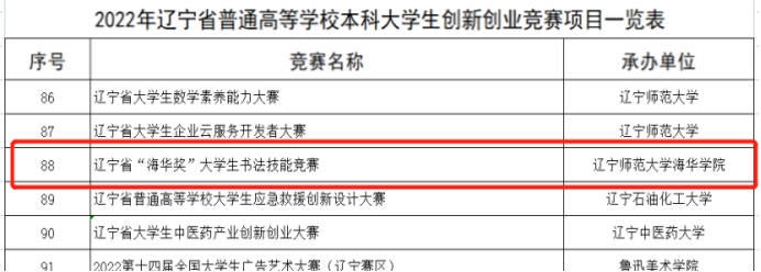 近日,辽宁省教育厅办公室发布了《关于公布2022年辽宁省普通高等学校本科大学生创新创业竞赛项目名单的通知》,beat365中文系申报的辽宁省“海华奖”大学生书法技能竞赛成功入选。