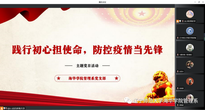 管理系党支部通过视频会议方式,组织全体师生党员开展“践行初心担使命,疫情防控当先锋”线上主题党日活动,凝聚起上下同心、众志成城、共克时艰的强大正能量。