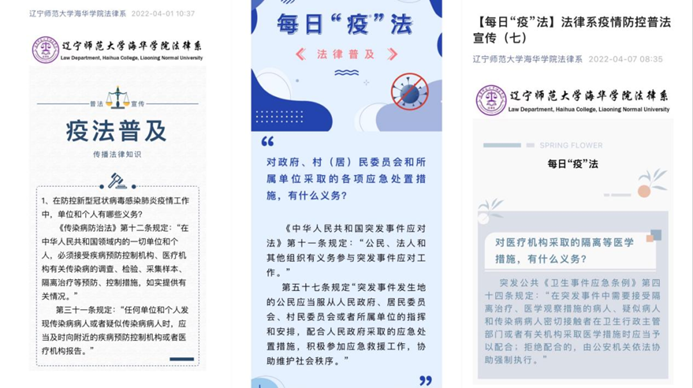 法律系系列推出《每日“疫”法》,教育引导师生依法抗疫,增强守法意识,主动报备行程轨迹,积极参加核酸检测,遵守疫情防控政策要求;组织开展以“众志成城抗击疫情”为主题“春”摄影大赛,丰富师生业余文化生活,讲述师生疫情防控期间感人故事,展现温情瞬间,引导师生热爱大美校园,激发师生坚持抗疫的斗志。