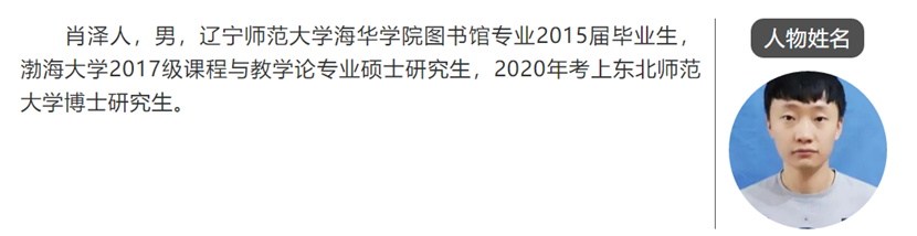 充满着期待和幻想,随着时间的前进和学习的深入,他渐渐的发现光读一个本科对自己的人生来说是远远不够的,于是他下定决心考研究生。在大四这个重要的人生转折点,肖泽人学长面临着下一个阶段的选择,他遵从本心,并脚踏实地的研究自己考研的优势,最终选择了报考渤海大学课程与教学论专业。在父母和老师的支持下,他坚定目标,脚踏实地,不懈努力,一步一个脚印的终于实现了自己的梦想,顺利考取渤海大学的课程与教学论专业研究生,正式开启了研究的学术生涯。