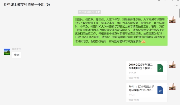 在各系部自查的基础上,5月11日至5月22日期间,教务处组织学院主管领导及各系部主任分三组进行了听课抽查。教学副院长王长松、院长助理兼教务处长王树海、教学质量监控与评估办公室主任梅显懋分别担任检查小组组长,分赴各系部对线上教学工作管理及运行情况进行抽查,各检查小组对全院各系部44名教师的在线课程进行了听课检查,覆盖全院各年级专业开设的线上课程,并收取了被检查教师开展线上教学以来留存的线上课程准备材料、在线教学互动数据、学生线上课堂笔记、线上课程作业布置、批改情况以及线上课程阶段测试、考核情况等电子材料。