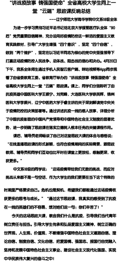 此次“云端”思政课是为落实教育部党组“停课不停教、不停学”的部署要求,是进一步贯彻落实习近平总书记给北京大学援鄂医疗队全体“90后”党员重要回信精神,也是疫情防控期间加强高校思政课教学组织工作的重要举措。特别邀请邀请中国医科大学王振宁、刘宪峰、大连医科大学徐英辉、锦州医科大学李振兴、辽宁中医药大学于睿进行直播授课,通过讲述亲身经历与感受,深刻解读党中央关于疫情防控的决策部署,分析中国抗疫彰显的中国共产党领导和中国特色社会主义制度的显著优势,引导大学生传承和弘扬爱国主义精神,树立正确的世界观、人生观、价值观,不断增强中国特色社会主义道路自信、理论自信、制度自信、文化自信,把爱国情、强国志、报国行自觉融入坚持和发展中国特色社会主义事业、建设社会主义现代化 强国、实现中华民族伟大复兴的奋斗之中。