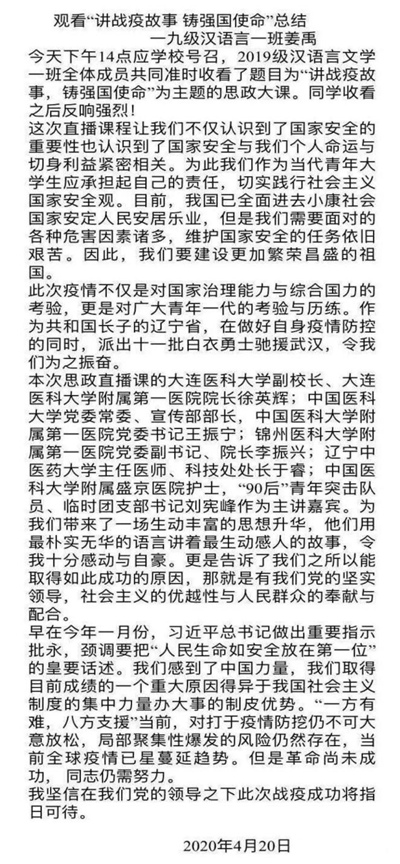 我院师生反映收看此次直播课后,受益匪浅,并围绕疫情期间党中央的英明决策部署、作为青年人应如何行动、对抗疫一线的工作人员表达感激等方面写出心得体会。