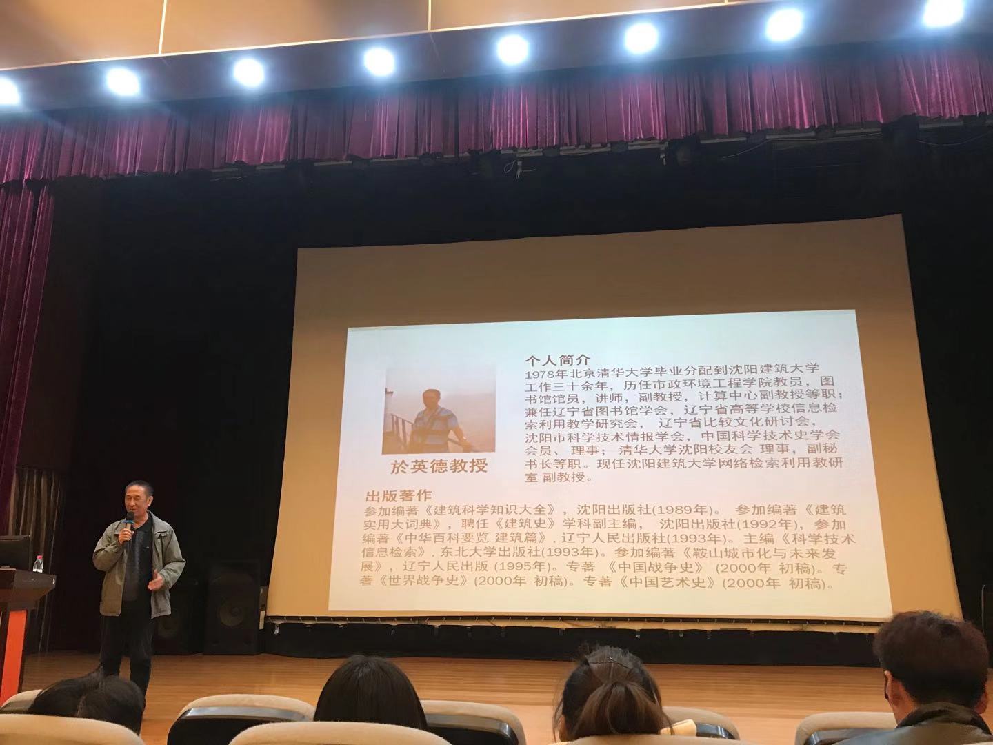 11月27号,星期三在教学楼A325报告厅开展了关于建筑鉴赏的讲座,我系邀请了北京清华大学毕业的於英德教授为我们讲述建筑艺术欣赏。在开讲前,我系辅导员迟达老师介绍了於英德教授,介绍完毕全场响起同学们热烈的掌声。