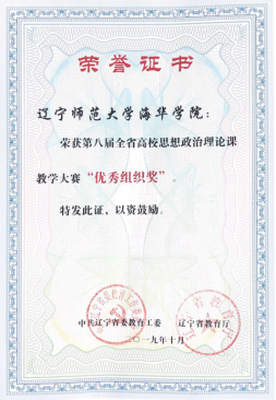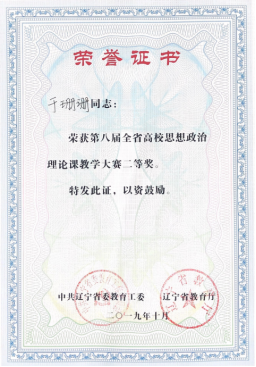为贯彻党的十九大精神和习近平总书记在全国学校思想政治理论课教师座谈会上的重要讲话,建设可信、可敬、可靠,乐为、敢为、有为的思政课教师队伍,我院思政部教师积极参与由中共辽宁省教育工委、辽宁省教育厅主办的第八届全省高校思想政治理论课教学大赛。经过近半年的激烈角逐,思政部于珊珊老师在省内70所高校200名优秀的参赛教师中不畏强手,敢于拼搏,荣获大赛二等奖,我院思政部也从70家高校的思政教学单位中脱颖而出,荣获“优秀组织奖”。