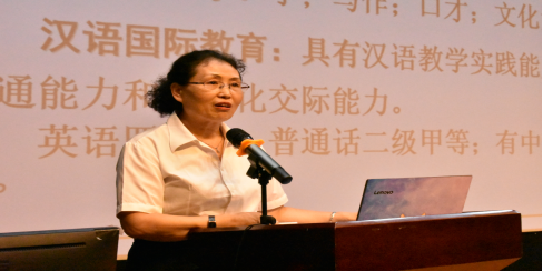 郑丽娜主任通过同学们选择报考中文专业的目的作为切入点,带领同学去思考:为什么要选择这个专业?我学了这个专业毕业以后干什么?能干什么?通过“你是否清楚毕业后可供你选择的职业方向”的设问,谈到汉语言文学专业和汉语国际教育专业的人才培养目标定位;从未来可供选择的职业岗位,谈到必须要为自己做好提升就业竞争力的准备;从专业优势、岗位需求的素质和技能要求,谈到中文专业特色培养。在谈到如何提升就业竞争力这个问题时,她说:我们已就汉语言文学专业特色培养达成共识,将专业技能训练作为保证人才培养质量的手段,将“熟读《古文观止》、能背诗词百首、写得一手好字、应用文体样样精通”作为实践教学目标,打造“出口成章、下笔成文”的专业人才来提升我们的就业竞争力。汉语国际教育专业要按汉语教师志愿者项目条件及应具备的基本能力做为人才培养目标。重点放在对外汉语教学能力(语言文字能力+文化能力+汉语教学能力)上,要将“英语四六级、普通话二级甲等、有中华才艺专长”作为专业技能目标,培养“具有汉语教学实践能力、外语沟通能力和跨文化交际能力”的专业人才来提升我们的就业竞争力。她还说:“作为主任,我给中文系教师设立的教育教学目标是:要培养有社会竞争力的人才。你们也要为自己设立这样一个目标:成为有社会竞争力的人才。”所以,一定要尽早为自己做好职业人生规划,才能行动有方向,学习有动力。