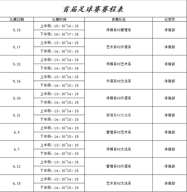 此次校园足球联赛为单循环积分赛,采取11人制方式进行,共有来自管理系、外语系、传媒系、艺术系、文法系共五支球队,134名球员,6名裁判员将参加为期一个月的12场足球比赛。
