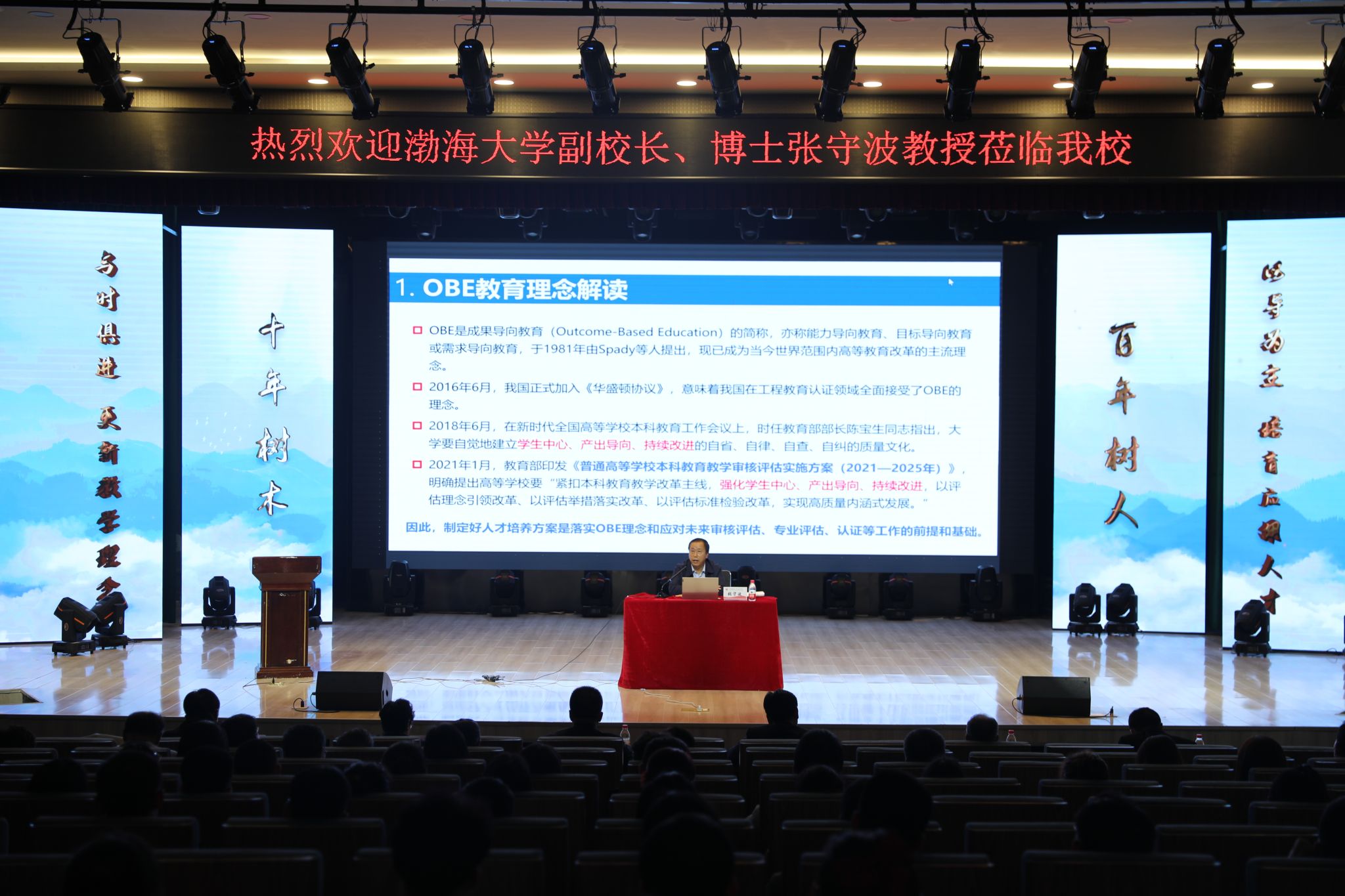 人间最美四月天,不负春光与时行。2023年4月19日下午,学校特邀渤海大学副校长、博士张守波教授,在厚德楼三楼报告厅为beat365全体教职工作了题为“OBE理念下人才培养相关问题的思考”的专题报告。院长王秀山主持报告会。党总支书记安化春、副院长赵春利、副院长于士君、党总支副书记张猛、院长助理王树海出席报告会。