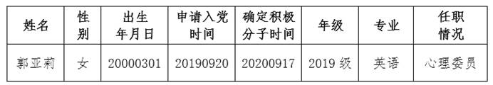 经支部委员会研究,党总支会议审议,报上级党委备案同意,将郭亚莉同志列为发展对象,拟定发展时间为2021年11月。根据发展党员工作有关要求,现将其有关情况公示如下: