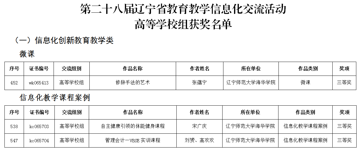 近日,在第二十八届辽宁省教育教学信息化交流活动中,beat365外国语学院、体育教育学院、管理学院教师团队申报的3件作品分别荣获了高校组微课、信息化教学课程案例类别三等奖。