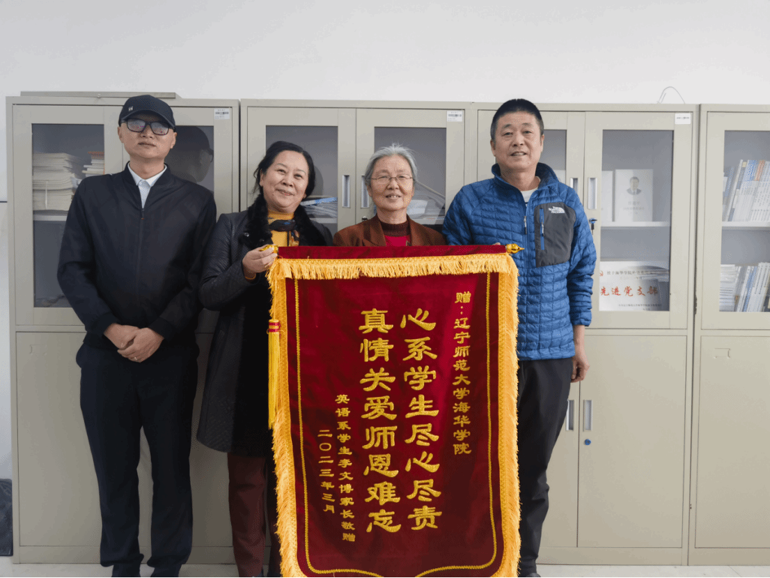 2023年3月14日,外语系2021届毕业生李文博家长来到学校,向外语系赠送写有“心系学生尽心尽责,真情关爱师恩难忘”的锦旗和感谢信,表达对外语系的感谢。