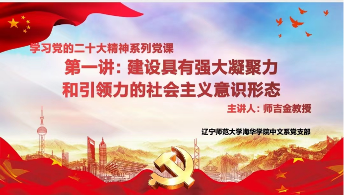 为深入学习贯彻落实习近平总书记在报告中的重要指示精神,将学习活动持续引向深入,11月30日中文系党支部邀请学校理论宣讲团成员、思政部师吉金教授通过腾讯会议的方式作了题为《建设具有强大凝聚力和引领力的社会主义意识形态》的主题宣讲,拉开了中文系学习党的二十大精神系列活动的序幕。中文系党支部书记郑丽娜主持会议,中文系全体教师和学生党员参加了此次宣讲活动。