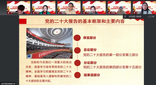 刘彦清教授重点围绕党的二十大报告基本框架和核心内容,从党的二十大的主题和主要成果和新时代伟大变革、开辟马克思主义中国化时代化新境界、以中国式现代化全面推进中华民族伟大复兴、全面建设社会主义现代化国家的目标任务、坚持党的全面领导和推进全面从严治党等方面对党的二十大精神进行了系统阐释和解读。我们党始终高举中国特色社会主义伟大旗帜,坚定中国特色社会主义道路自信、理论自信、制度自信、文化自信,坚定不移地推进中华民族伟大复兴进程;我们党要全面贯彻习近平新时代中国特色社会主义思想。二十大报告主题明确了举什么旗帜的问题,阐明了发扬什么样的中国精神,阐明了保持什么样的精神状态,指明了向着什么样的目标前进的重大问题,指明了全党应保持什么样的精神品质。
