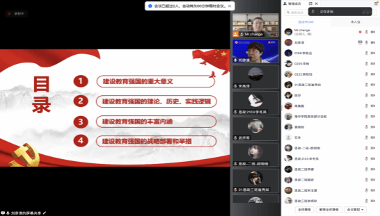 为进一步把学习贯彻习近平新时代中国特色社会主义思想主题教育引向深入,推动学习往深里走、往实里走、往心里走,不断增进对党的创新理论的政治认同、思想认同、理论认同、情感认同,自觉从习近平新时代中国特色社会主义思想中汲取奋发进取的智慧和力量,6月30日晚,马克思主义学院党支部组织开展党支部书记讲党课主题教育活动。党支部书记刘彦清以《加快建设教育强国,为中华民族伟大复兴提供有力支撑》为题为支部全体党员讲党课。党支部成员和学生入党积极分子线上参加了此次党课。