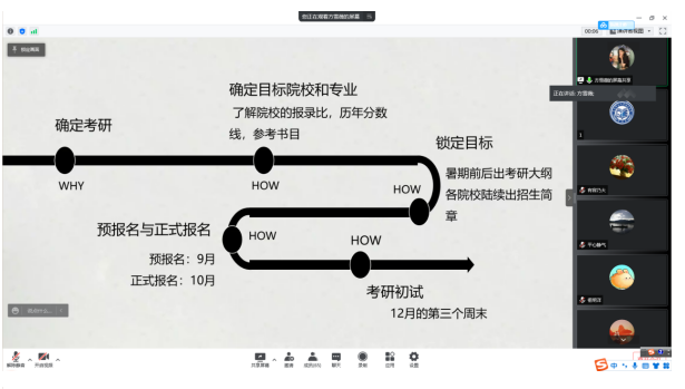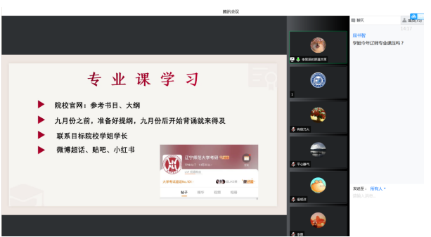 会议伊始,管理系2018级辅导员刘一兰从考研形势、2018级考研情况向参会人员做了简单介绍。对今日参加分享的两位2018级同学进行了详细的介绍。接着,考取辽宁大学思想政治教育专业的2018级旅游管理专业方雪薇和考取辽宁师范大学图书情报与档案管理的2018级图书馆学专业李昊泽分别从考研目标选择、考研分数定位及复习计划等多个方面与参会学弟学妹们分享了备战2022年考研时的经历和经验,以此来鼓励学弟学妹们扎实努力备战考研。