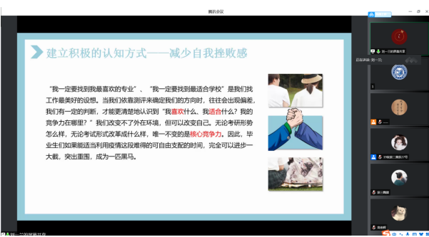 为切实做好校园常态化疫情防控工作,帮助管理系2019级考研学生缓解因疫情而产生的心理压力,进一步提升学生备战考研的心理调适能力,促进高效率、高质量的复习计划稳步开展。5月20日18时,管理系利用腾讯会议组织召开2019级考研学生心理疏导讲座。管理系主任栾美晨教授、教学副主任朱爱辉副教授、辅导员及2019级考研学生参加本次讲座。讲座由管理系学生工作负责人梁瑜主持。