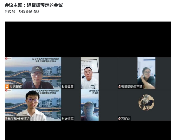 为响应学校就业工作部署,进一步加强外语系校企合作,拓展毕业生就业岗位。2022年7月14日,外语系主任许迎军,副主任迟曜辉,毕业年级辅导员曲祾奥、韩英俊,教学秘书郑怀远及部分专任教师与多家企业进行线上交流活动。