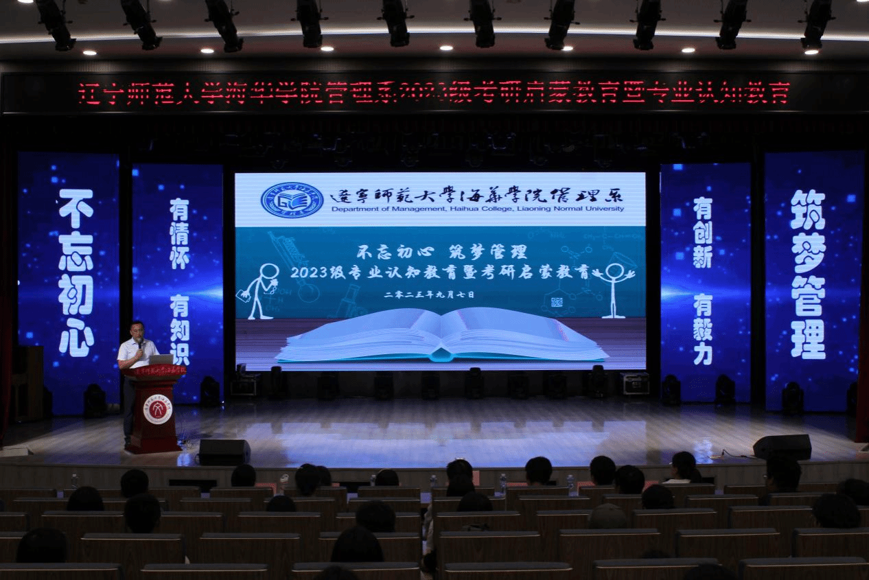 为深入学习和全面贯彻习近平新时代中国特色社会主义思想,切实做好 2023 级新生入学教育,帮助其尽快适应大学生活,完成角色转变,增强自我教育、自我管理和自我服务的能力,树立正确的世界观、人生观和价值观,系好人生的第一粒扣子,管理系于2023年9月7日在厚德楼报告厅组织召开2023级新生专业认知教育暨考研启蒙教育专题会议。管理系主任栾美晨、教学副主任朱爱辉、教研室负责人及任课教师、2023及全体新生参加会议。会议由新生辅导员主持。