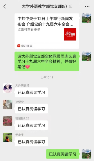 通过此次学习,全体党员同志对中国共产党百年奋斗史有了更加深刻的认识,一致表示一定会把十九届六中全会的精神领会好,落实好,增强“四个意识”、坚定“四个自信”、做到“两个维护”。作为高校教师,要始终牢记“为党育人、为国育才”的神圣使命,加强自身修养,注重课程思政,把党的宝贵精神传承发扬下去;作为党员,要加强“四史”学习,提高理论素质,要始终坚守初心,坚定理想信念,在各方面都要起模范带头作用,遇到困难时身先士卒,接受实践的检验,百炼成钢。在此次疫情中,大外部全体党员都能以高度的责任意识,统一听指挥,在餐食配送、网课教学和安抚学生等方面发挥自己的作用,相信我们同舟共济,一定能战胜疫情,迎来胜利的曙光!