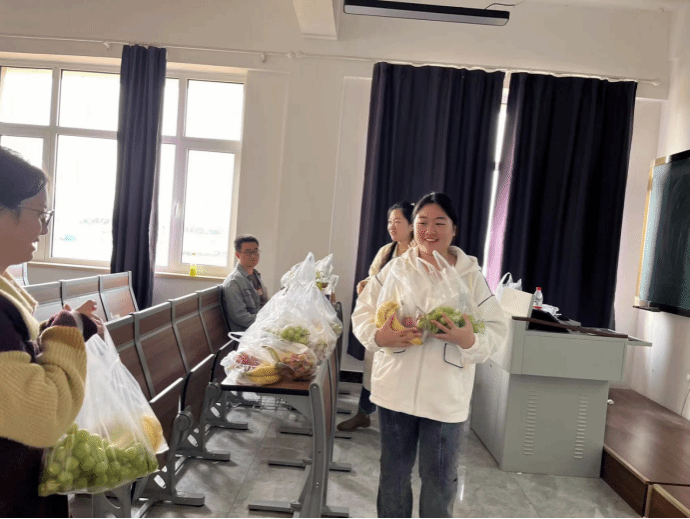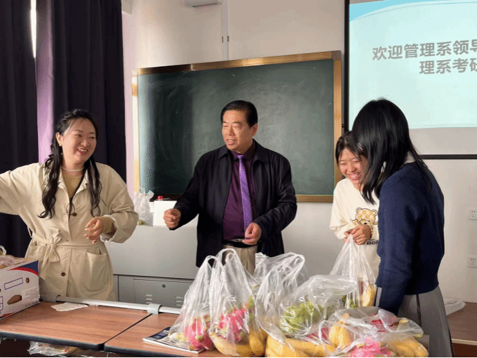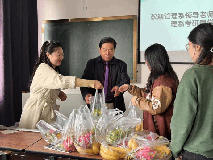随后,老师们一边将悉心准备的水果递给学生,一边鼓励大家“祝你们考研顺利!已经到最关键的阶段了,吃点水果补充维生素,一定要放平心态,考出理想的成绩!”同学们拿到沉甸甸的礼包,禁不住笑着感叹:“这么大的葡萄!今天太有福气了。谢谢老师!”你来我往间的话语,诙谐幽默的语言和热情轻松的氛围,不禁让紧张备考期间的暖意,流淌在现场每一个师生的心间。