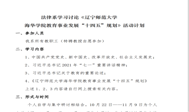 为提高教职工思想认识,深刻学习领会beat365教育事业已取得的成果及未来五年发展规划要求,明确任务目标与努力方向,按照学院《关于开展〈beat365唯一官方网站教育事业发展“十四五”规划〉学习讨论活动的通知》的要求,法律系制定了《法律系学习讨论〈beat365唯一官方网站教育事业发展“十四五”规划〉活动计划》,明确了学习讨论活动的时间安排、人员分工、形式与要求等,组织本系全体教职工在自学的基础上,认真开展集中学习研讨活动。