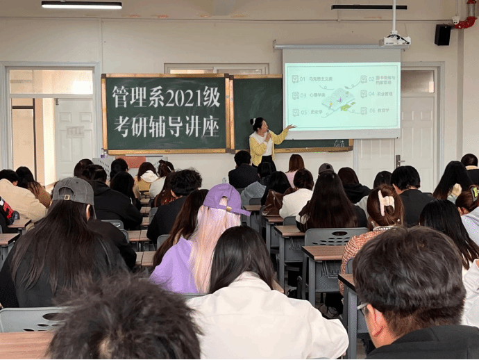 为进一步推进学风建设,帮助同学们对考研有清晰的认识和规划,调动同学们的考研积极性,明确奋斗目标,解决考研困惑,提升学习效率。2023年10月25日,管理系在日新楼2-102教室,组织召开2021级学生考研辅导讲座。管理系主任栾美晨教授、教学副主任朱爱辉副教授、教研室责任人、辅导员参与并与全体学生亲切座谈交流。本次讲座由辅导员主持。