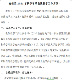 秋季学期开学以来,因受疫情影响,学生不能按照原定开学日期返校上课,给教学工作带来了新的挑战。法律系积极贯彻落实《辽宁省教育厅关于进一步加强暑期全省教育系统疫情防控工作的紧急通知》、《beat365唯一官方网站关于秋季学期开学有关事项的通知》》及《beat365唯一官方网站2021年秋季学期疫情防控形势下在线教学工作方案》等文件要求,结合本单位实际制定了《法律系2021年秋季学期在线教学工作方案》,成立了法律系线上教学工作小组,认真组织,周密安排,全力做好线上教学工作。
