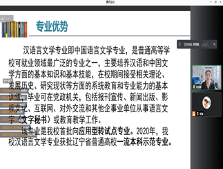 中文系主任郑丽娜从中文系整体介绍、汉语言文学专业介绍、职业规划和学校管理规定等方面展开进行专业教育。首先,郑丽娜老师对大一新生的到来表达了热烈欢迎和殷切期望;其次,郑老师对中文系的师资队伍、科研获奖和活动比赛进行了讲解,之后重点讲解了汉语言文学专业的培养定位、课程体系、发展前景等,特别是和同学们今后的人生规划紧密结合,阐明了课程设置和教学安排对同学们在求职和考研方面的帮助。最后,从毕业论文、课堂行为规范、考试规定和转专业管理等方面让同学们明确了教学管理规定。郑老师讲解全面细致,为同学们扫除迷茫,明确人生的方向,同时勉励同学们珍惜当下时光,拼搏努力,让梦想插上翅膀。
