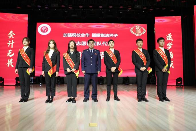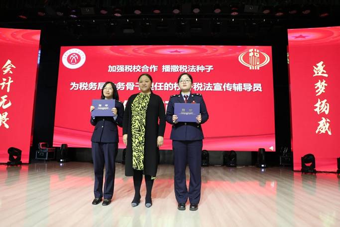 揭牌仪式标志着新的开始,希望我们以此为契机认真组织落实好各项活动,积极发挥好会计系各项平台的优势作用,科学谋划、科学决策、加强创新,为创建文明,新颖的税法宣传示范基地做出新的贡献。接下来由田院长为税务局业务骨干担任的校外税法宣传辅导员颁发证书;周局长向志愿者团队代表颁发“爱国护税,从我做起”税法宣传志愿服务者绶带。