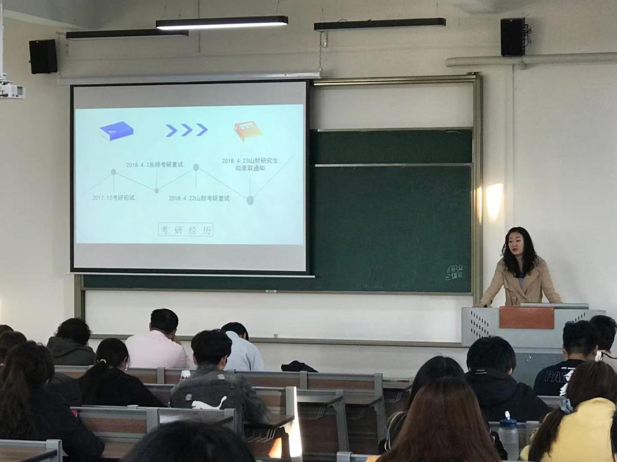 会议上邀请了管理系图书馆学青年教师史雯荻为2018级考研同学做考研经验分享。她结合自身考研经历从考研择校、暑假复习、考研复试、调剂等多方面现身说教,将自己备战考研的经验与参会同学进行分享交流。不定时的与参会同学进行现场互动,会议现场掌声雷动。