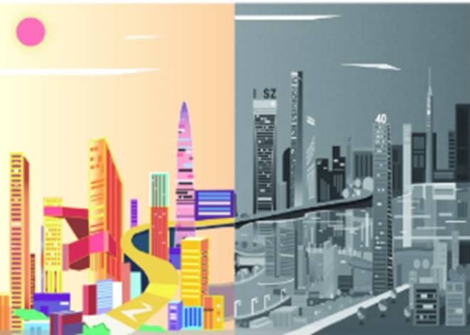 以“建党一百年、讴歌新时代”为创作主题。在改革开放以来,许多城市也发生了重大的变化,所以这次我选用深圳这座城市来对改革开放新时代展开设计. 这幅作品是我根据深圳改革开放前后做对比,显而易见左边是改革开放前右边是改革开放后,至于颜色的分配 为什么改革开放后使用灰色系呢?这里我用灰色系代表黑夜,在跟改革开放前对比,改革开放后的深圳在晚上灯火通明,不仅楼层变高,绿化也变得好起来,交通道路也有了路灯照亮,其中一楼层上有40的数字代表改革开放四十周年,古人说“四十不惑”,对深圳而言,“不惑”意味着走中国特色社会主义道路更加坚定、推进改革开放的决心更为牢固、实现未来发展蓝图的信心更为充足。