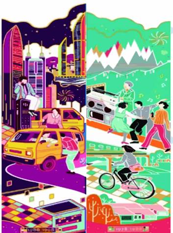 本次设计是以“建党一百年,讴歌新时代为主题展开设计,此次我们设计的选题是以改革开放为背景进行创作,我本次进行设计是以改革开放人们的生活对比为创作,右边是改革开放前人们的生活现状,有青山绿水整体颜色也是以绿色为主色背景,画面中人们跟着录音机播放的音乐唱着歌跳着舞,那时候最普遍的交通工具是自行车,火车当时也有普及是那种经典的绿皮火车,房子也是平方,左边是改革开放后初期人们的生活现状,这时候已经有了翻天覆地的变化整体颜色以紫色为主要背景颜色,有了高楼大厦,出现了通讯工具电话,交通工具也有了很大的变化,从以前的自行车变成了现在随处可见的四轮汽车,画面中男子坐在大哥大上打电话也表示着通讯工具的快递普及以及应用,黄色的面包车象征着我们现在的出租车,两张图的对比表现出改革开放前后的变化以及快速的发展,也展现出改革开放的繁荣昌盛。
