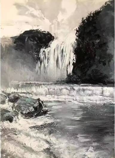 写意画法,色彩采用黑白灰最简单的色彩搭配,前后层次分明,体会古人“高山流水”的诗情画意。远山近水的静态描写,几度歌颂了祖国的大好河山。