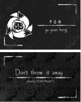 此名片正面是左右分割型的构图,整体以对比强烈的黑白色调为主。左边是以我个人喜好与形象进行设计的一个图案,而右边则是用横线进行分割的我的中文名字与其拼音。背面是上下分割型的构图,并以中心的横线分割“Don’t throw it away”——请不要丢弃它与我的电话号码。