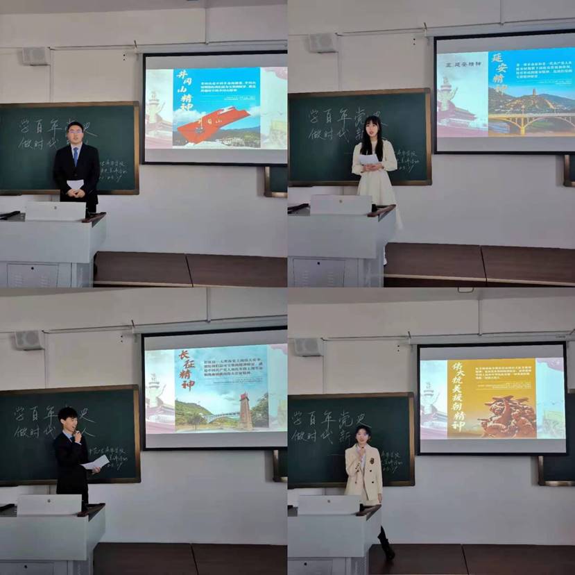活动开始,主持人李文广从“以史为鉴,可以知兴替;感悟党史,积蓄奋斗力量;认识过去,在于传承精神”等方面说明本次活动的意义。紧接着八位主讲人一一上台发言:赵明慧同学讲解“红船精神”、徐江洋同学讲述井冈山精神历史、张喆同学分享长征故事、冯广燕同学讲解“遵义会议精神”、张馨文同学讲述“延安精神”、赵蕴博同学分享了“西柏坡精神、马诗惠同学带来“伟大抗美援朝精神”、孙溪源同学分享了“伟大抗疫精神”。