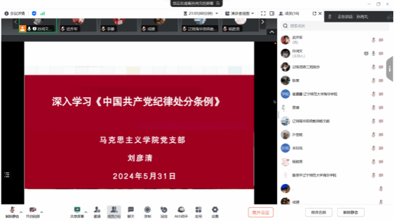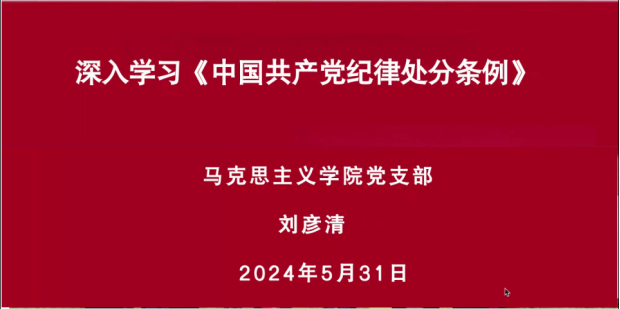 党的纪律建设是中国共产党百余年建设中形成的宝贵经验,是党内政治生活的核心和灵魂。为了扎实开展党纪学习教育,2024年5月31日晚,马克思主义学院党支部于线上召开会议,会议的主要议题是进行党纪学习教育,党支部书记刘彦清为全体党员上了一堂题为“深入学习《中国共产党纪律处分条例》”的党纪学习教育课。