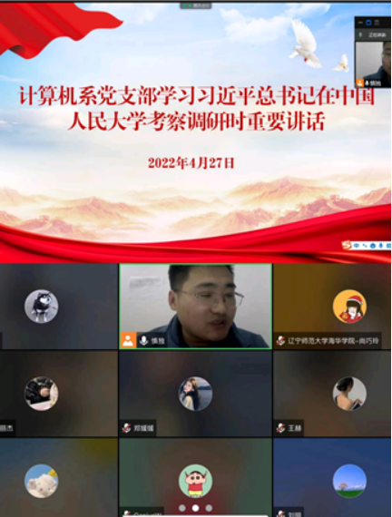 2022年4月25日,在五四青年节即将到来之际,习近平总书记到中国人民大学考察调研,并发表重要讲话。4月27日晚,计算机系党支部开展专题学习,深刻领会、贯彻落实习近平总书记到中国人民大学考察时重要讲话精神;参会的教师党员、学生党员和积极分子积极发言,分享自己的所思所感。