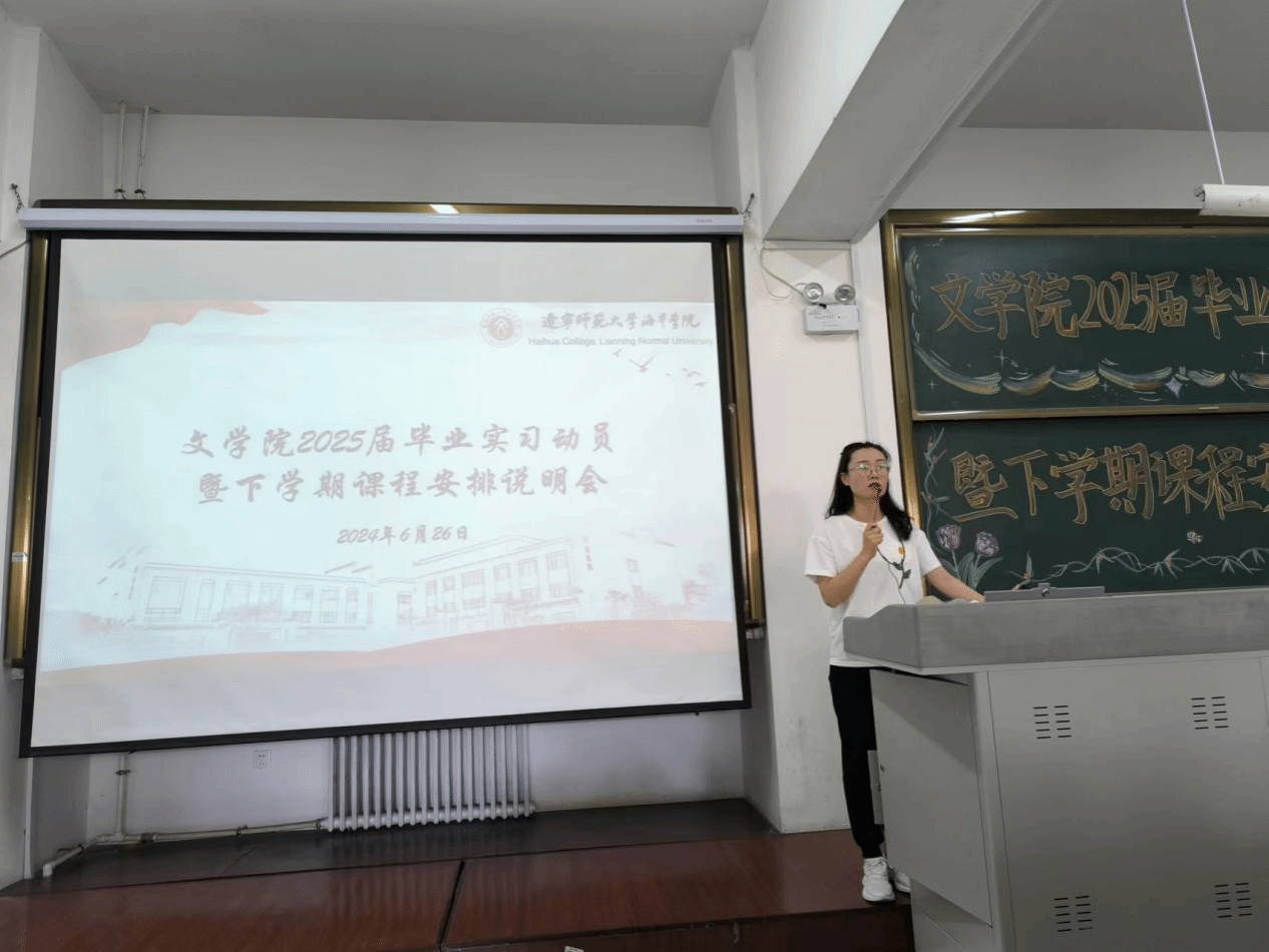文学院于2024年6月26日上午,分两场在博学楼A123阶梯教室召开2025届毕业实习动员暨下学期课程安排说明会下学期教学安排说明会。文学院院长郑丽娜分别为汉语言文学专业、汉语国际教育专业和新闻学专业21级学生(25届毕业生)共计507人进行实习动员,21级辅导员张博凯、冷传捷、张峰源与会,文学院教学负责人曲波主持。