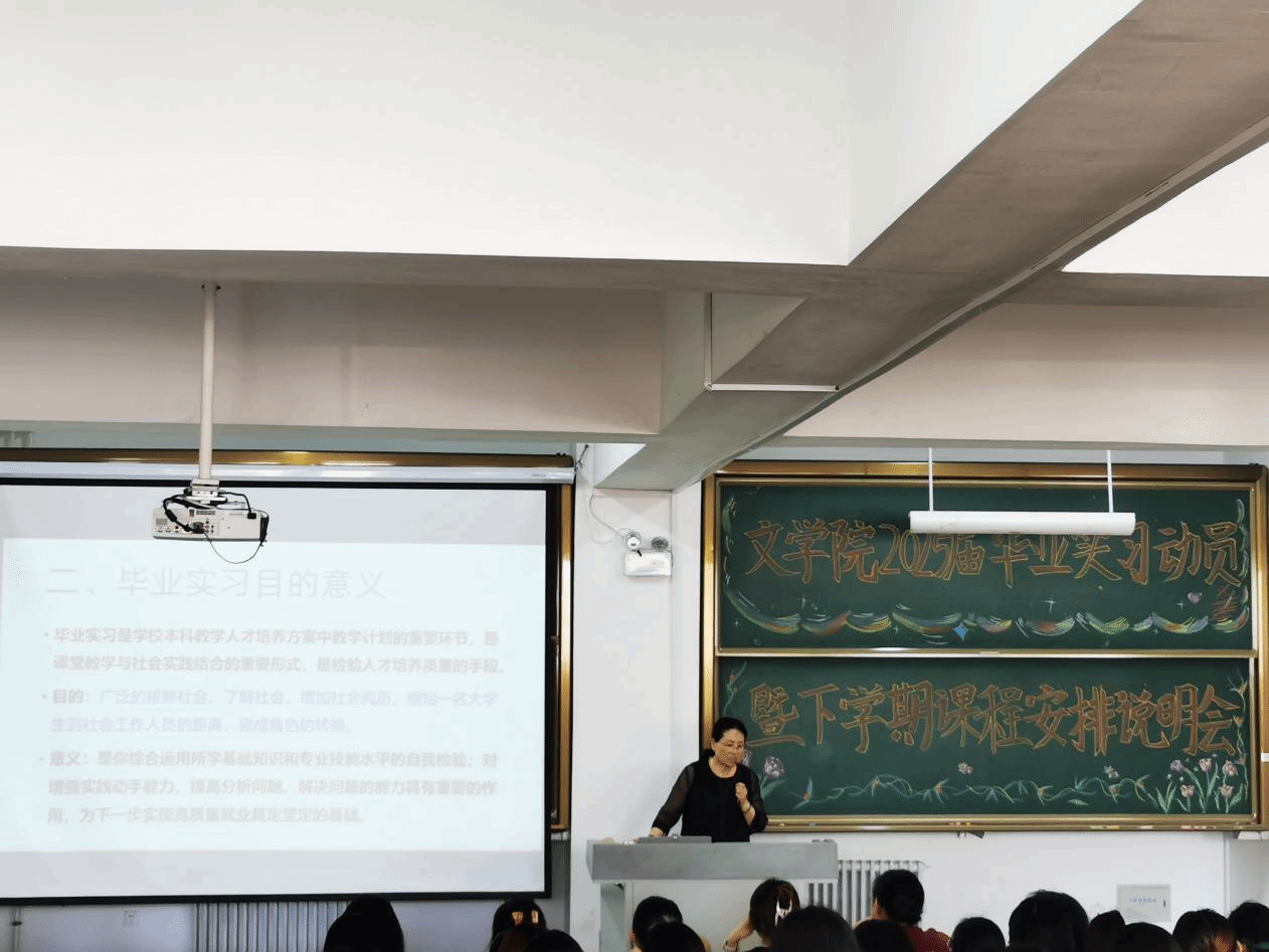 文学院2025届毕业实习动员暨下学期课程安排说明会让21级同学进一步明确了整个大四阶段的教学计划安排,提高了他们对毕业实习的目的及意义的认识,为他们合理规划自己的后半部分实践教学任务、圆满完成学业具体重要的指导意义。
