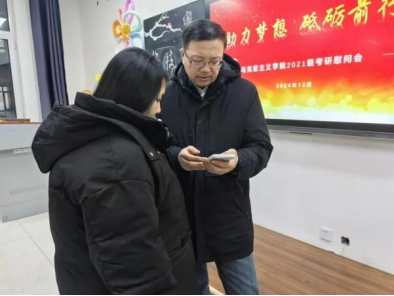在考研临近之际,马克思主义学院以“等枝丫,成繁花”为主题,召开了一场温馨而庄重的21级学生考研慰问会。马克思主义学院院长刘广东、党支部书记兼副院长刘彦清、副院长孙鸿文、学生工作负责人杨鹏志及各教研室老师齐聚一堂,与 21 级考研学子共话未来,现场气氛热烈,展现出浓厚的师生情谊与学院关怀。