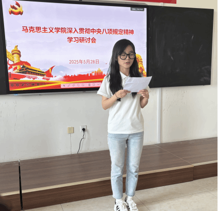 在交流研讨环节,参会人员积极发言。杜晶波教授表示,落实中央八项规定,在教学方面,要坚决杜绝形式主义,注重教学实效,提升思政课教学质量;要满腔热情对待学生、对待教学。孙鸿文副院长强调对待教学科研工作,要严守学术道德底线,反对学术不端行为,营造风清气正的学术氛围。贾倩同志提出在课堂教学中要切实以学生为中心,避免照本宣科,通过生动案例和互动式教学,让学生真正理解和认同党的理论与路线方针政策,这也是贯彻中央八项规定精神,务实教学作风的体现。针对我们学院考研这一中心工作,我们要根据学生的实际情况制定报考院校规划建议,经常走入学生中,了解学生复习动态和学习进程,进行有针对性的辅导。发现学生情绪上的问题,要及时疏导,提供心理支持。学生党员李冬凤也发表了学习习近平总书记关于作风建设相关论述的感悟:身为学生党员,要秉持严谨求学态度,拒绝浮躁学风;在学生管理工作中,坚持关心学生、服务同学;在生活方面,要传承勤俭节约美德,摒弃铺张浪费。