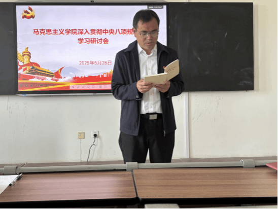 会议伊始,学院党支部书记刘彦清传达了学校关于深入贯彻中央八项规定精神学习教育的相关文件要求,强调了此次学习研讨会的重要性与必要性。刘彦清强调中央八项规定是新时代加强党的作风建设的重要举措,关乎党在人民群众心中的形象,关乎党和国家事业的发展。马克思主义学院作为传播党的理论、培养思政人才的重要阵地,全体党员更应深刻领会中央八项规定精神实质,以身作则,将其融入日常教学、科研与管理工作中。